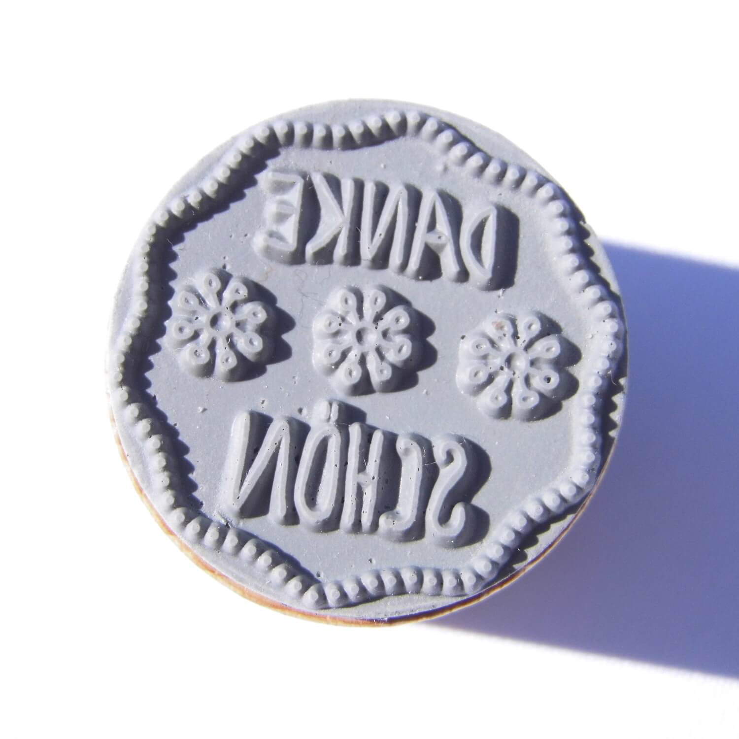 Toller runder Stempel für Dankeskarten. Kleine zarte Blumen runden den Schriftzug auf dem Stempel zusätzlich ab.