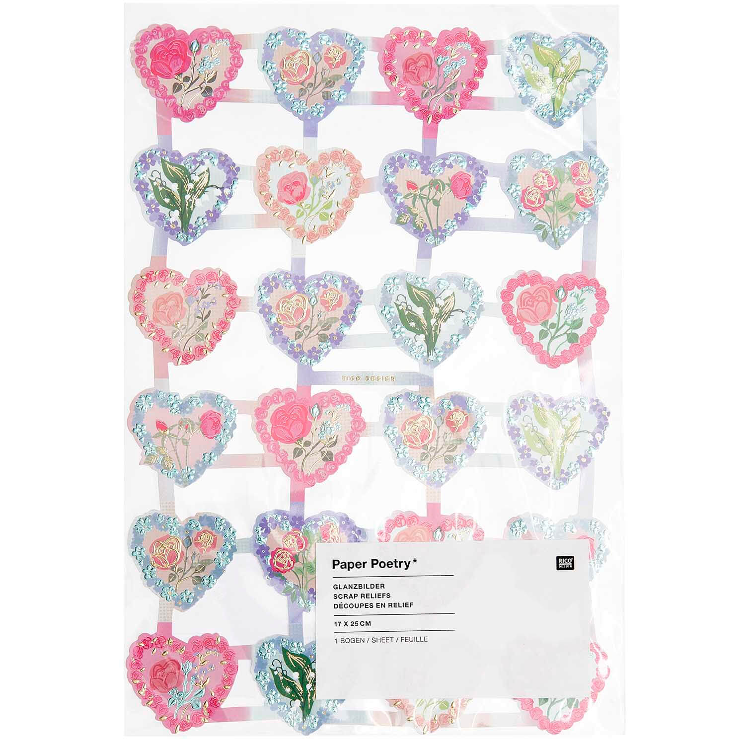Glanzbilder verleihen kreativen Werken eine Extraportion Eleganz und Romantik, besonders mit diesen strahlenden Herzmotiven! Die Glanzbilder Herzen sind perfekt, wenn es darum geht, mit liebevollen Details und funkelnden Highlights verschiedene Bastelarbeiten zu verzieren. Mit ihrem schimmernden Glanz setzen sie stilvolle Akzente und lassen jedes selbstgemachte Design erstrahlen. Zudem sind die Herzen kunstvoll mit zarten Rosen und verspielten Maiglöckchen verziert, die ihnen eine noch romantischere und verträumte Note verleihen.