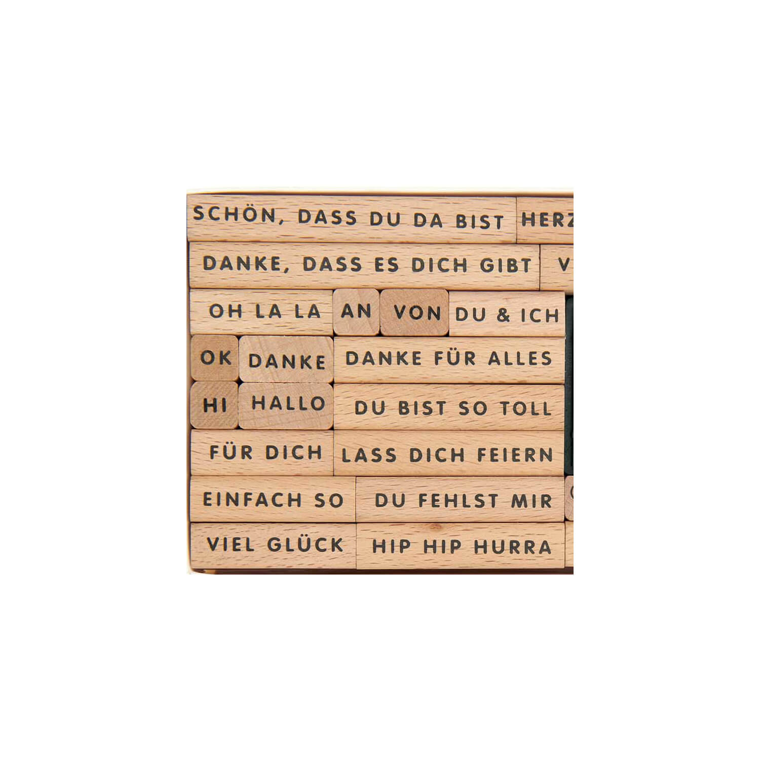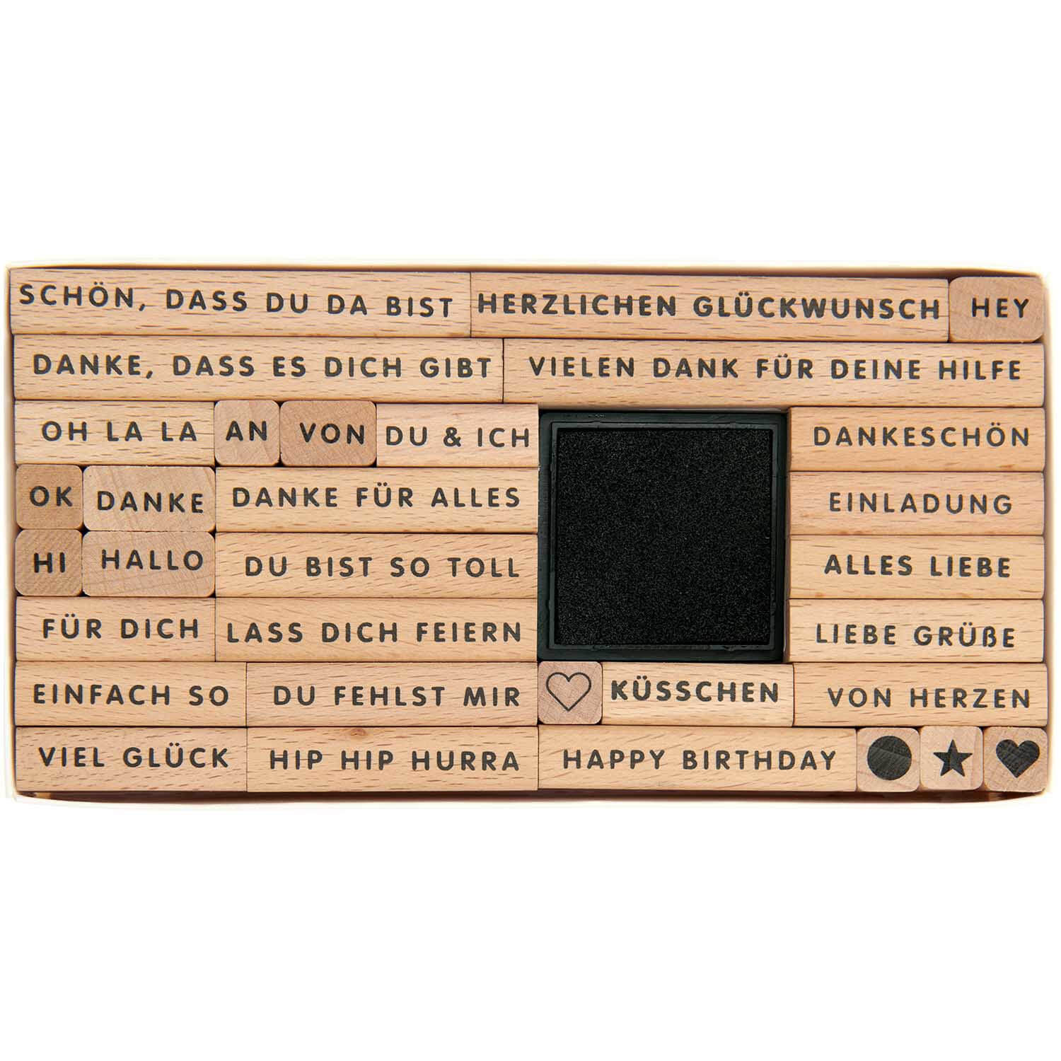 Das Stempelset enthält Stempel für Glückwünsche, Grüße und andere Texte für verschiedene Anlässe. Die Holzstempel sind perfekt für selbstgemachte Einladungen, Geschenkanhänger und Geschenkverpackungen. Ein Tuschestempelkissen in schwarz gehört gleich mit dazu. Kleine Symbolstempel mit Herz oder Stern runden das umfangreiche Stempelset ab.