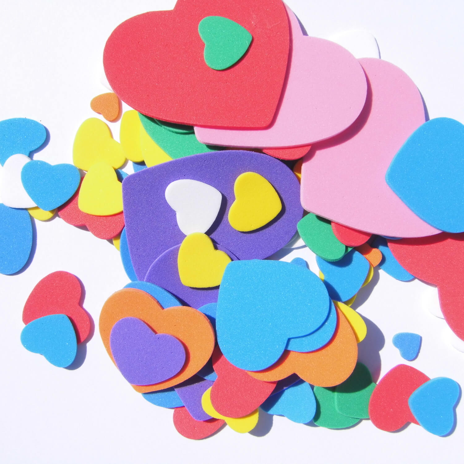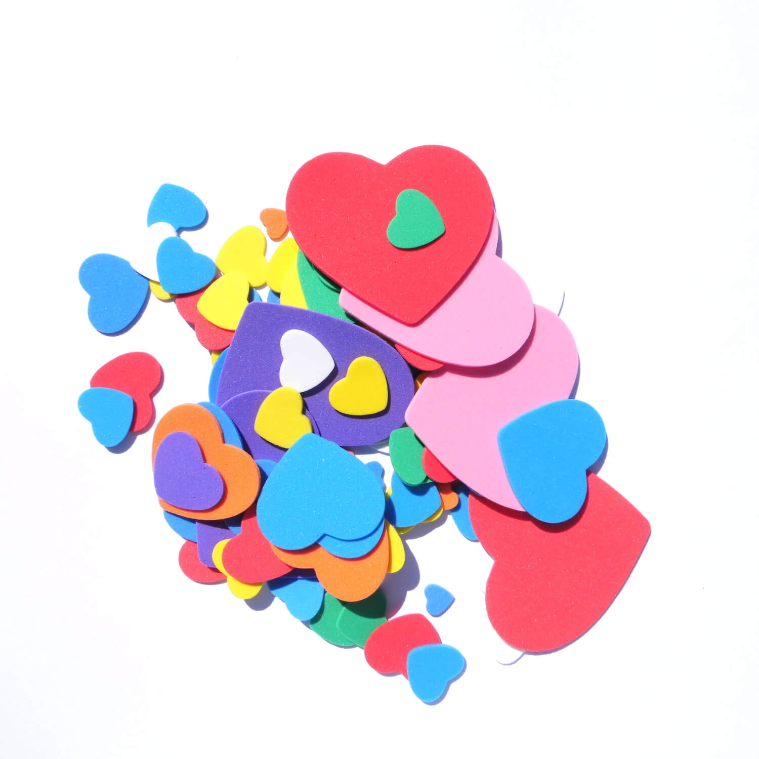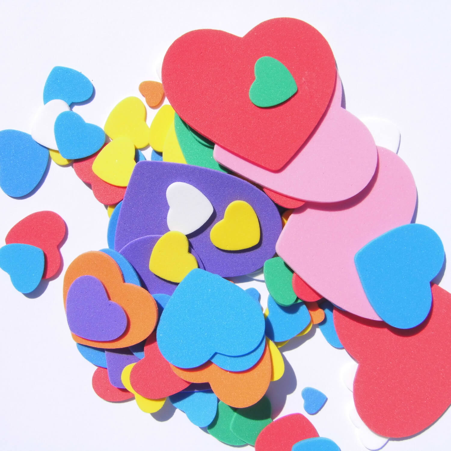 In dieser Packung sind 90 Herzen in unterschiedlichen Farben und Größen. Gestalte mit den Moosgummiherzen Karten oder auch Deko.