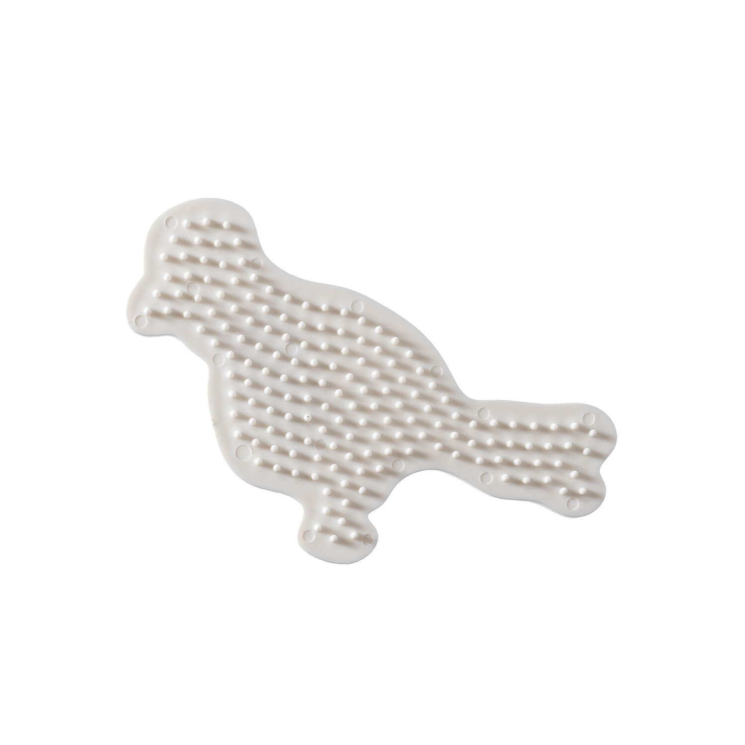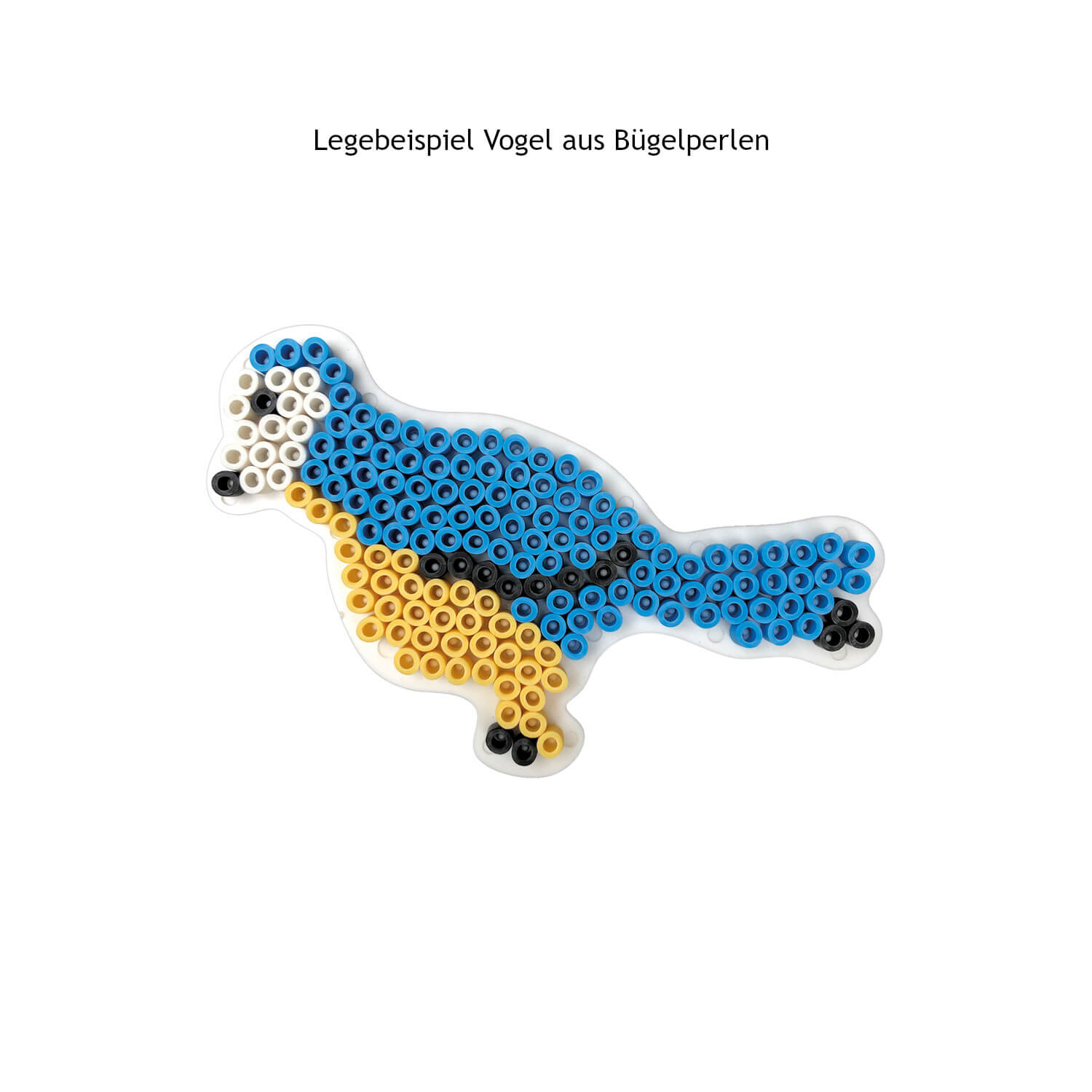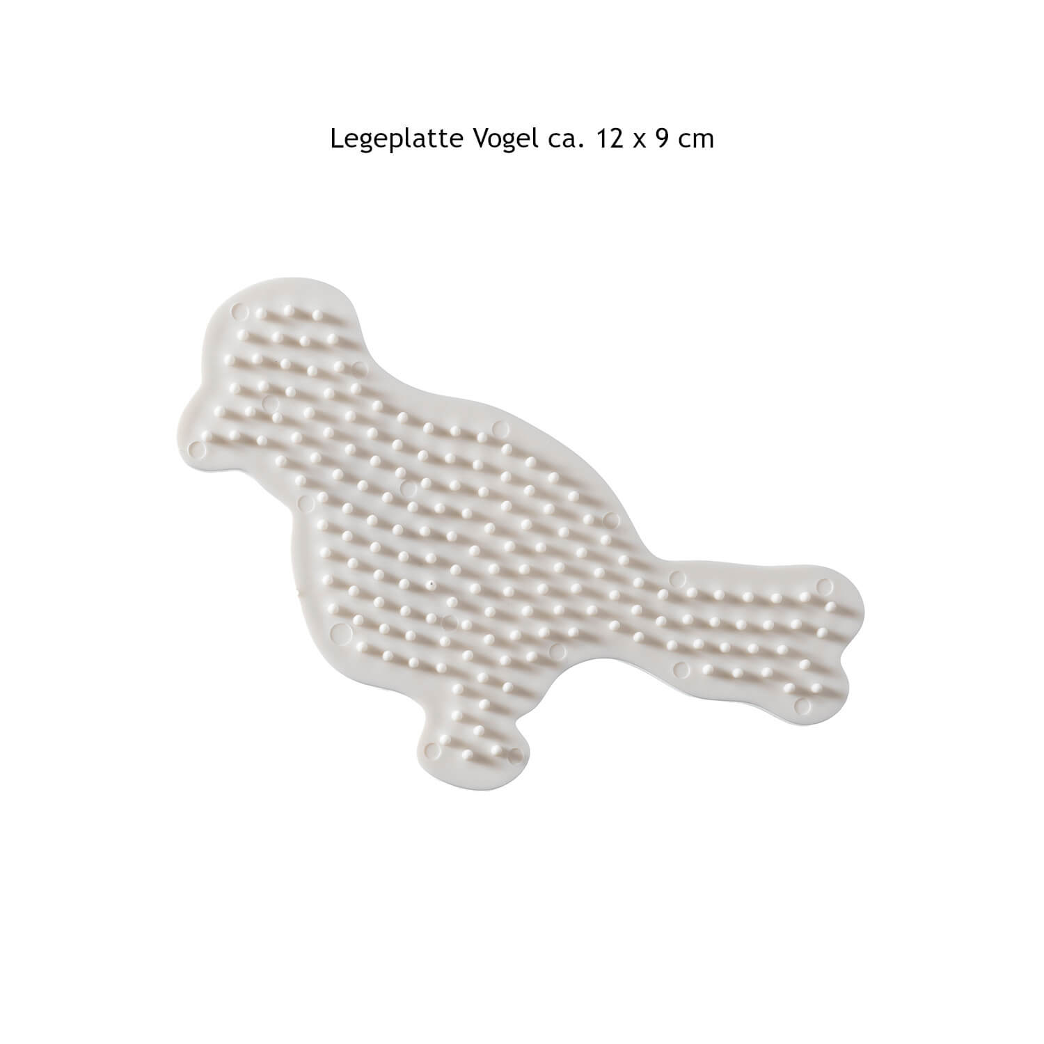 Die weiße Legeplatte Vogel hat eine Größe von ca. 12 x 9 cm. Mit ihr lassen sich aus bunten Bügelperlen tolle Vogelmotive legen.
