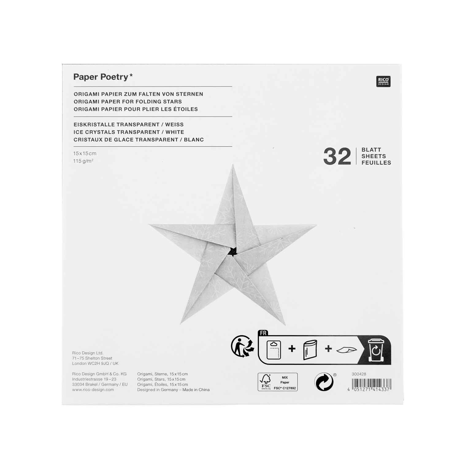 Die kunstvoll gestalteten, quadratischen Origami Blätter mit einer Größe von 15 x 15 cm bieten eine harmonische Kombination aus Transparenz und filigranen, weißen Schneeflocken. Jede Packung enthält 32 Faltblätter aus hochwertigem Papier mit einer Grammatur von 115 g/qm.