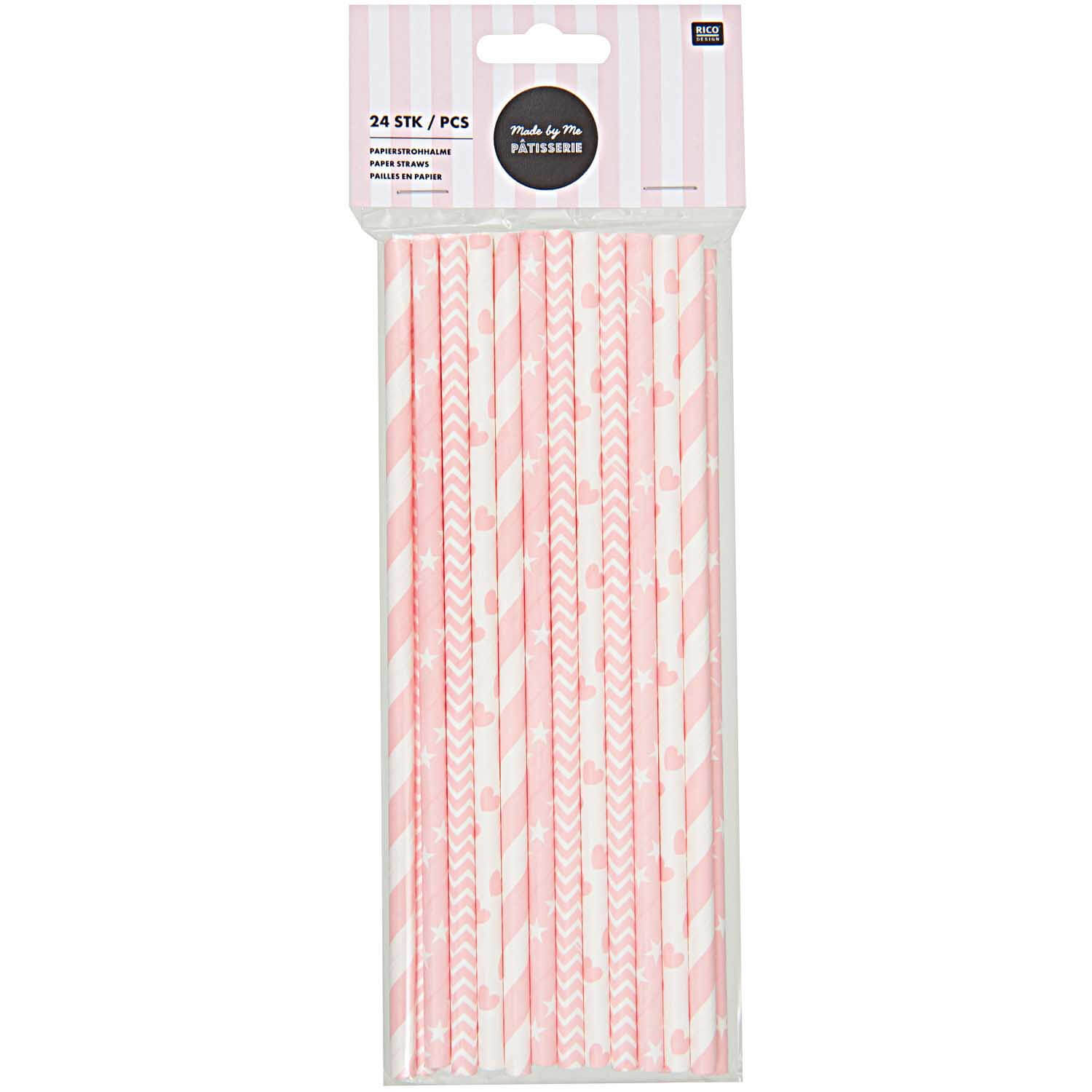 Papiertrinkhalme rosa-weiß – 24 Stück, gemustert mit Herzen, Sternen & Streifen