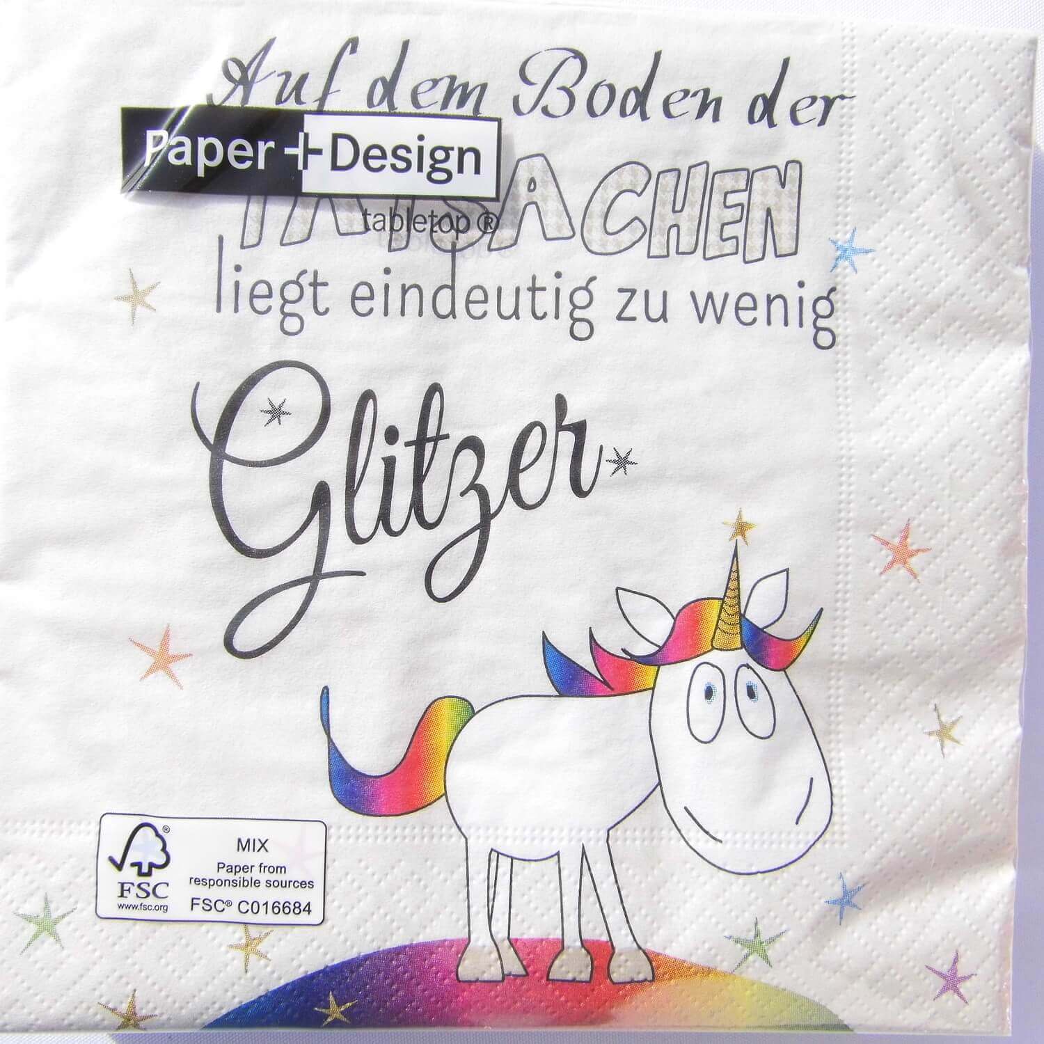 "Auf dem Boden der Tatsachen liegt eindeutig zu wenig Glitzer" lautet der Spruch auf diesen beigefarbenen Servietten. Tolle Serviette verziert mit regenbogenfarbenen Einhorn und bunten Sternen. Die Servietten eignen sich prima für verschiedene Partys. Die Gäste werden Augen machen, wenn diese Servietten auf ihren Tellern oder Plätzen liegen. Das Motto der Serviette bietet sich auch förmlich für eine Motto-Party an.