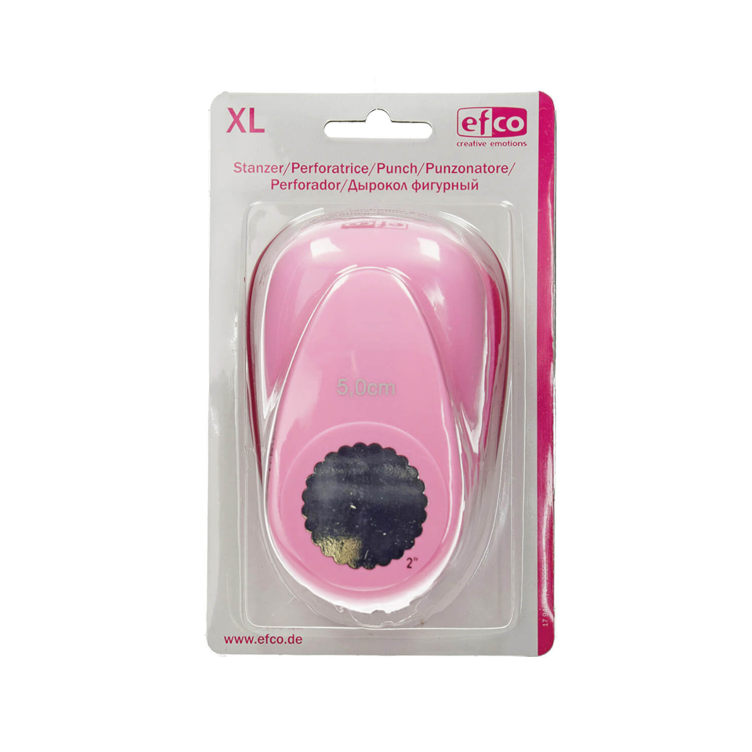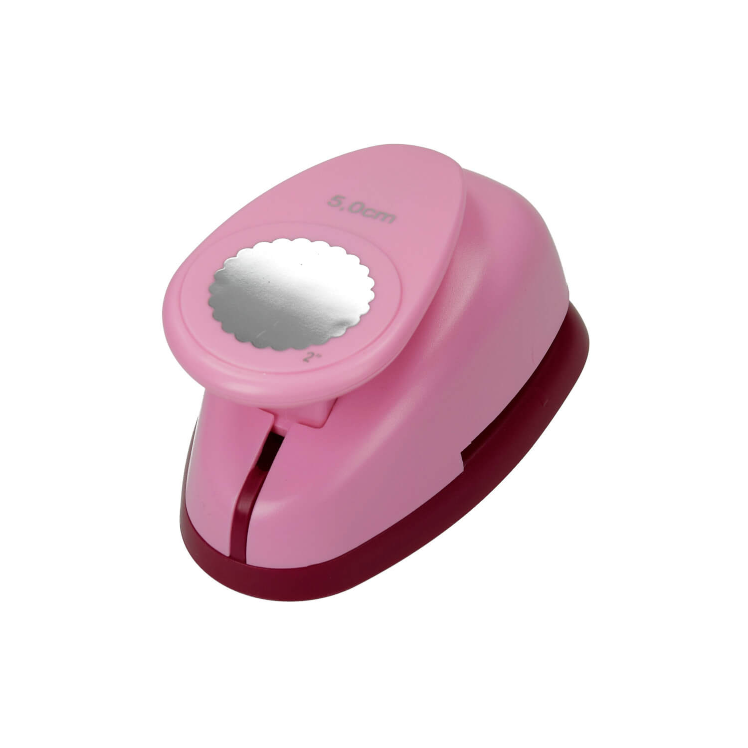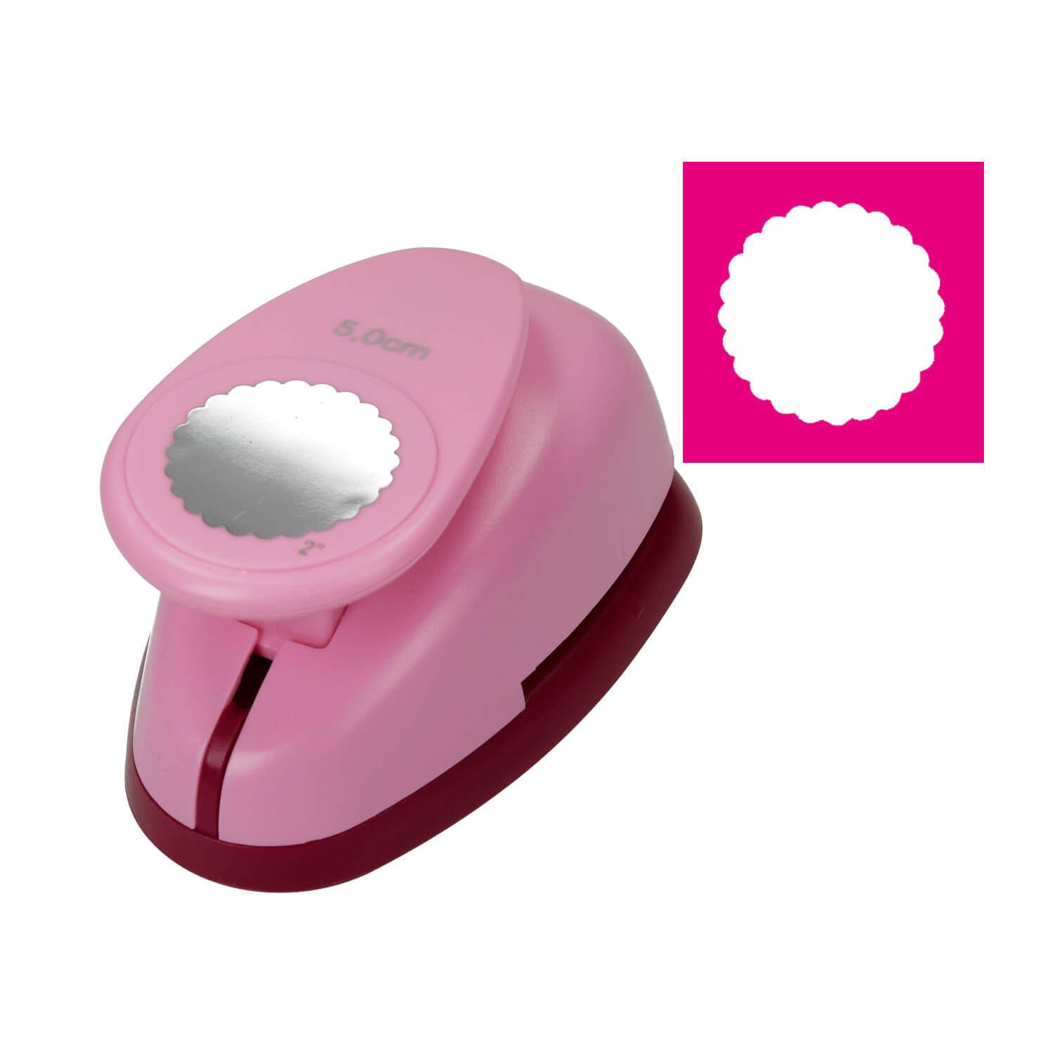 Mit diesem Stanzer lassen sich Etiketten oder Anhänger in einer Größe von ca. 49 mm stanzen. Die Kreise sind verziert mit einem Wellenrand.