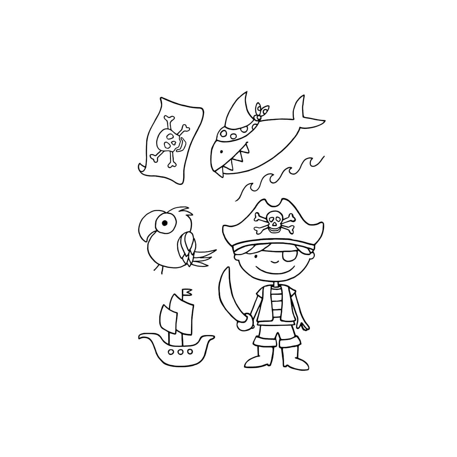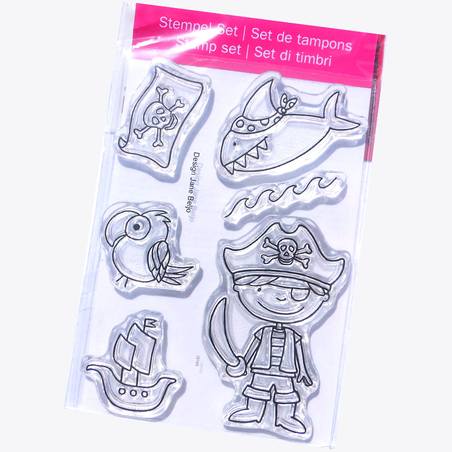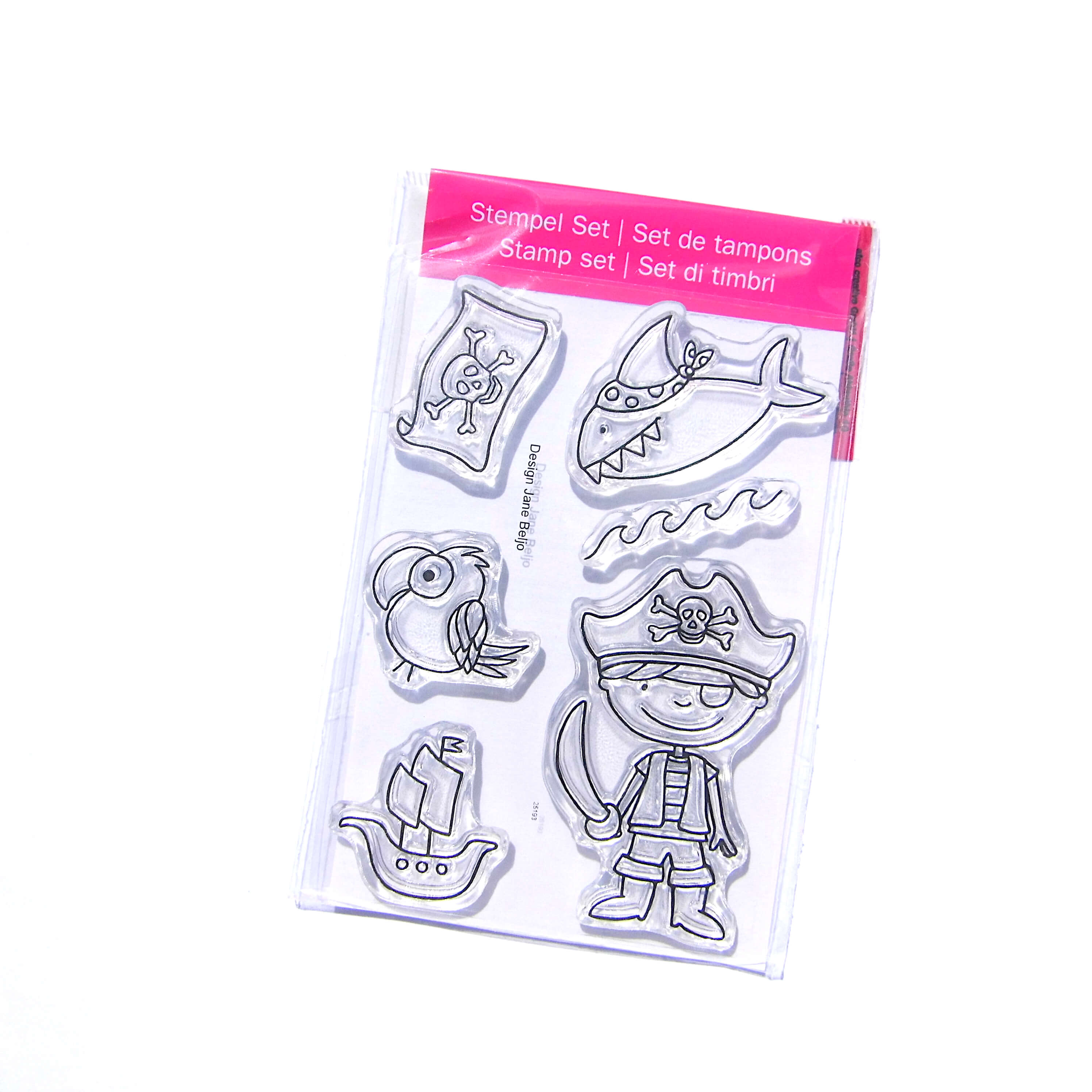 Die 6 Stempelmotive sind ideal für die Einladung zur Piratenparty anlässlich eines Kindergeburtstages. Die aufgestempelten Motive lassen sich auch ausmalen und so können tolle bunte Bilder auf den Einladungskarten entstehen. Gleichzeitig können auch die Mitgebseltütchen mit den transparenten Stempeln verziert werden.