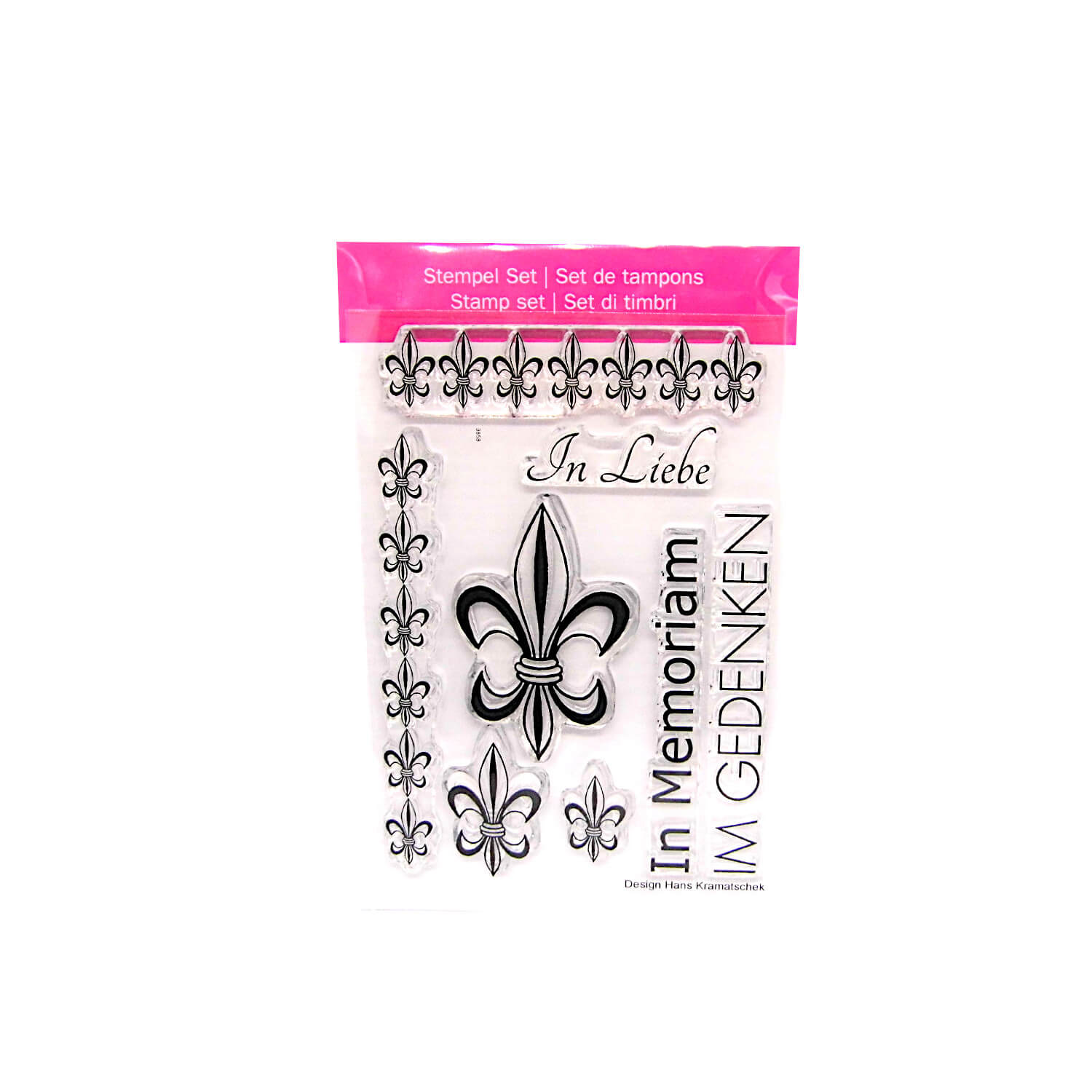 In dem Set mit transparenten Stempeln sind Lilien einzeln und als Bordüre vorhanden. Mit den schönen Schriftzügen lassen sich wundervolle Karten selber gestalten.