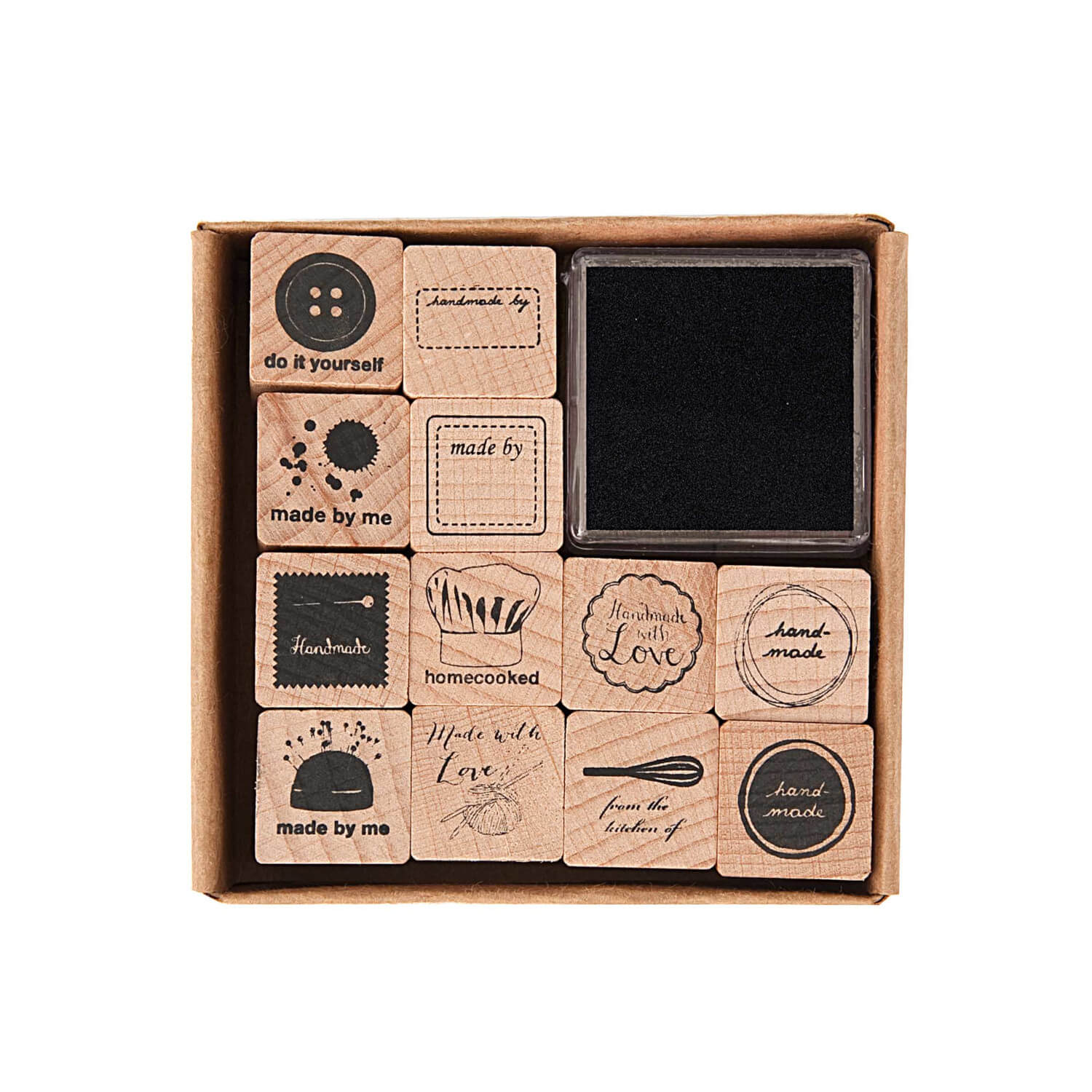 In diesem 13-teiligen Set mit verschiedenen Stempeln für alle Selbermacher ist ein Stempelkissen direkt mit enthalten. Die Stempel eignen sich zum Verzieren von Etiketten für Selbstgemachtes.