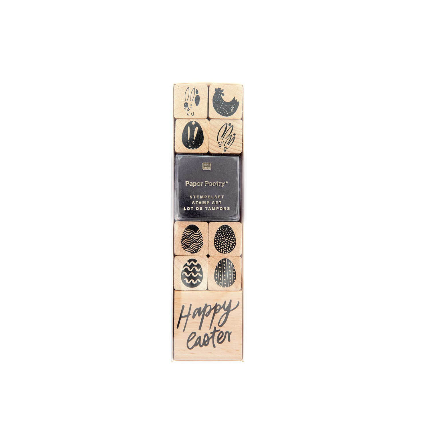 Zu diesem tollen Stempelset Happy Easter gehören 9 Stempel und 1 Stempelkissen in schwarz. Mit den niedlichen Ostermotiven lassen sich Osterkarten leicht selbermachen. Einfarbiges Geschenkpapier kann mit den Holzstempeln prima verziert werden.