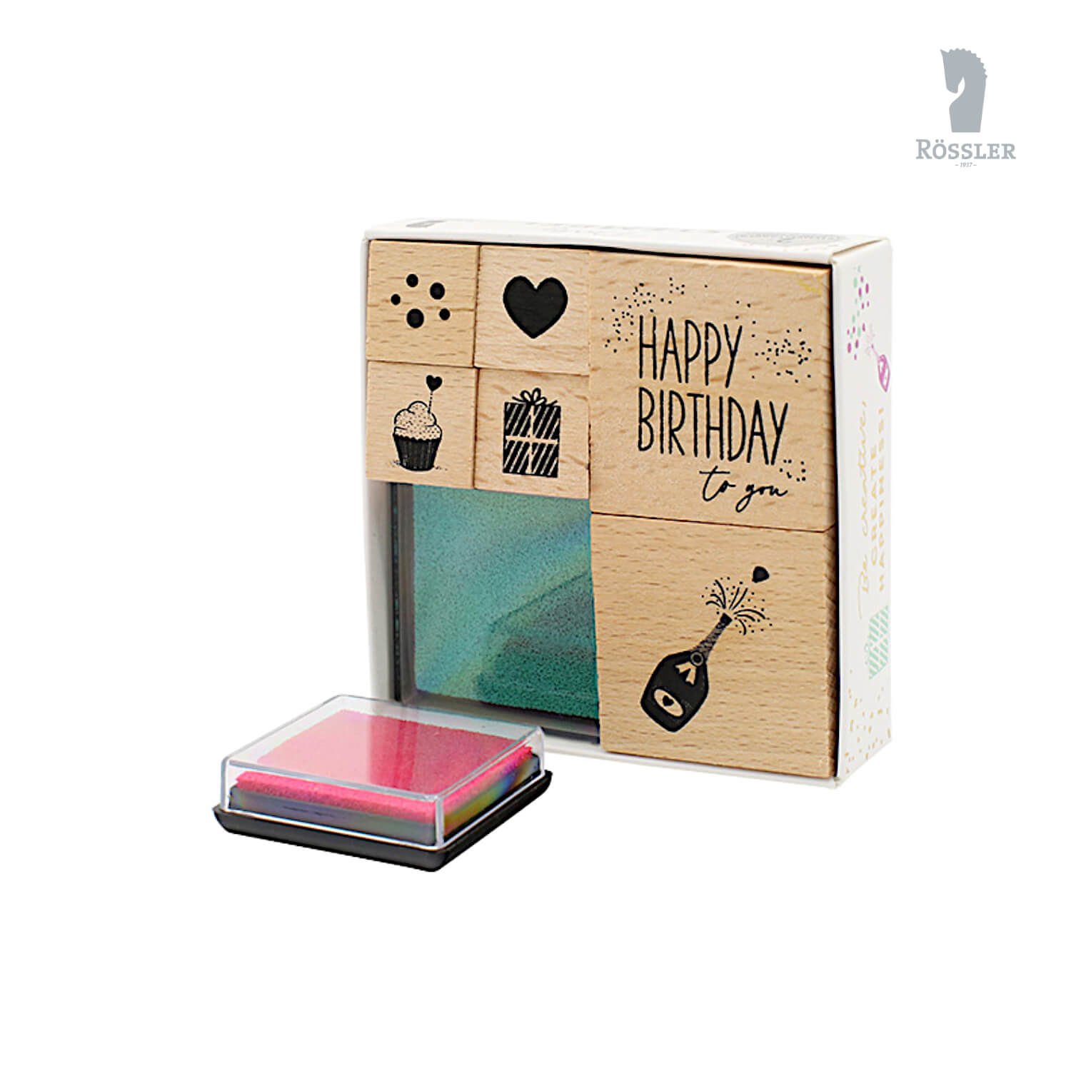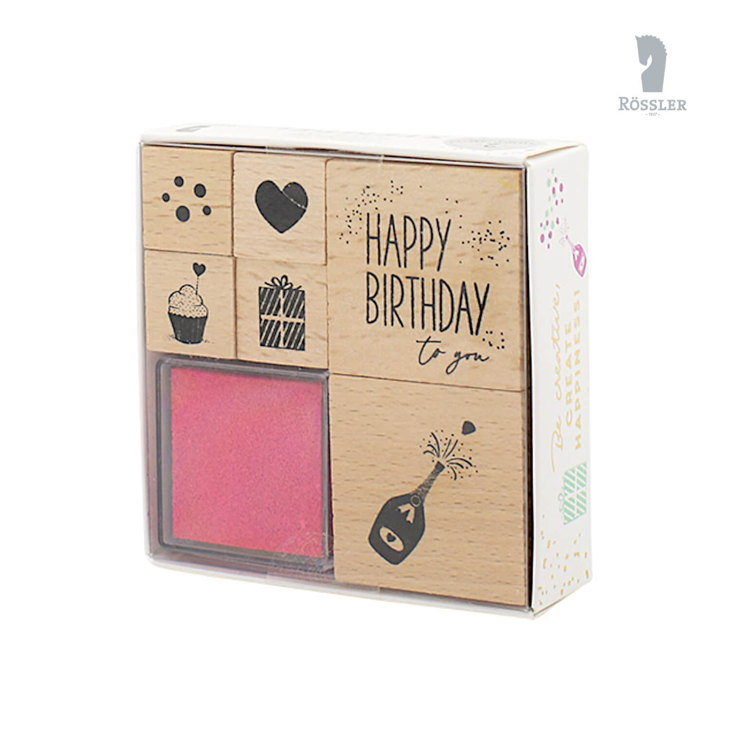 Die zwei größeren Stempel (je 4 x 4 cm) zeigen die Schriftzug-Variante „Happy Birthday to you“ in moderner Typografie sowie ein charmantes Motiv einer geöffneten Sektflasche – perfekt, um die Korken auf dem Papier knallen zu lassen!