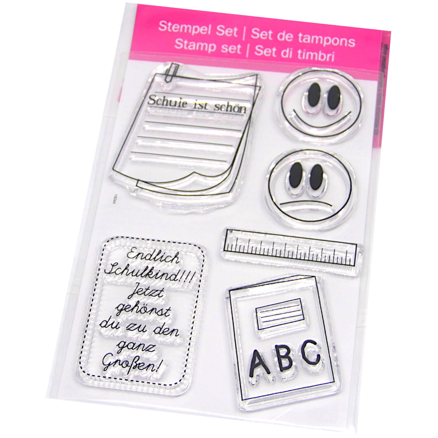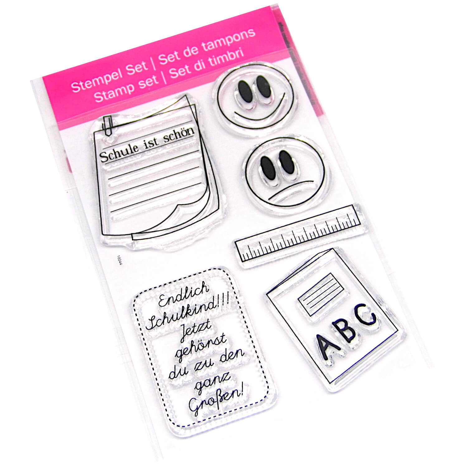 Mit dem 6-teiligen Stempelset können Glückwunschkarten zur Einschulung gestaltet werden. Die transparenten Stempel lassen sich individuell auf einem Acrylblock platzieren und dann kann das Stempeln losgehen.