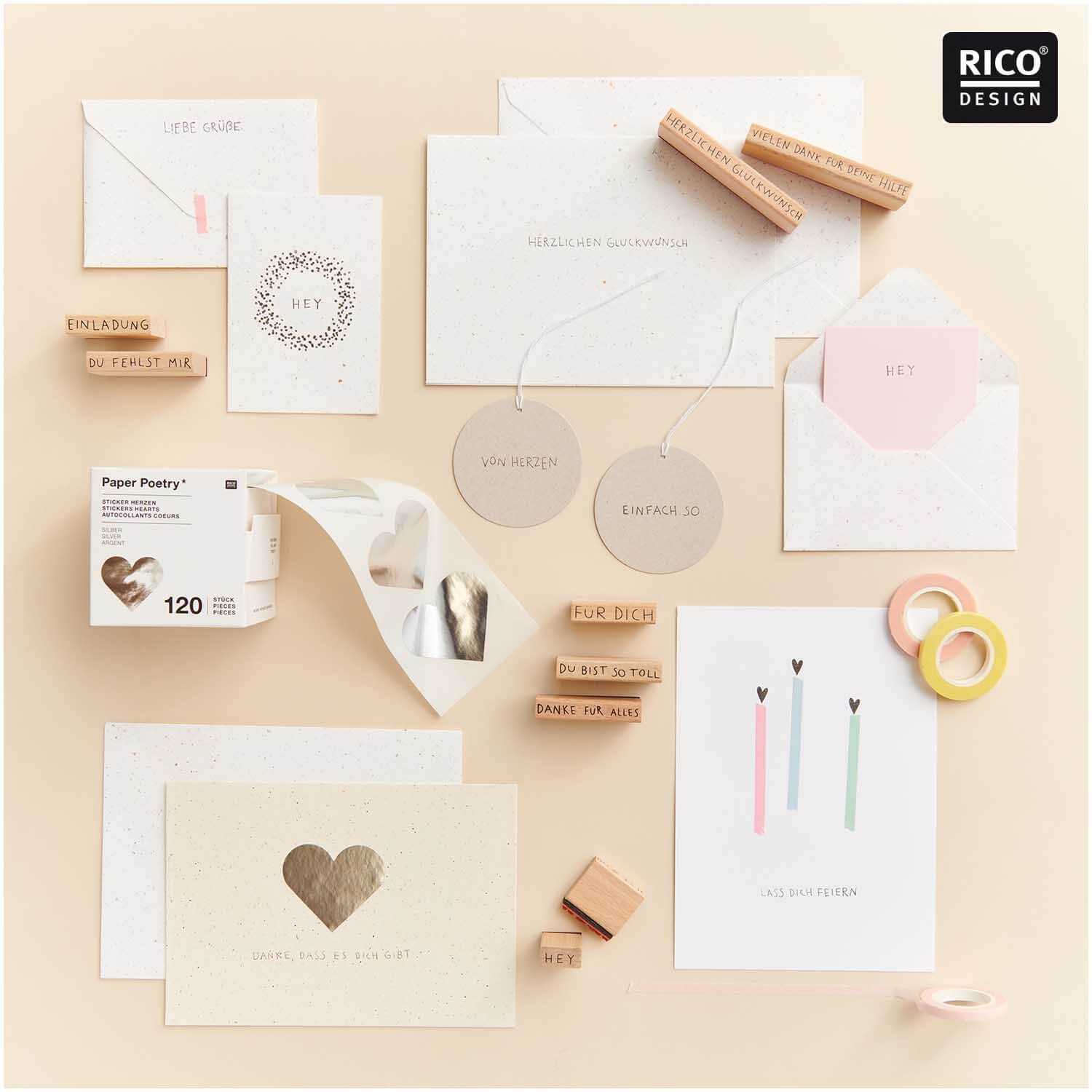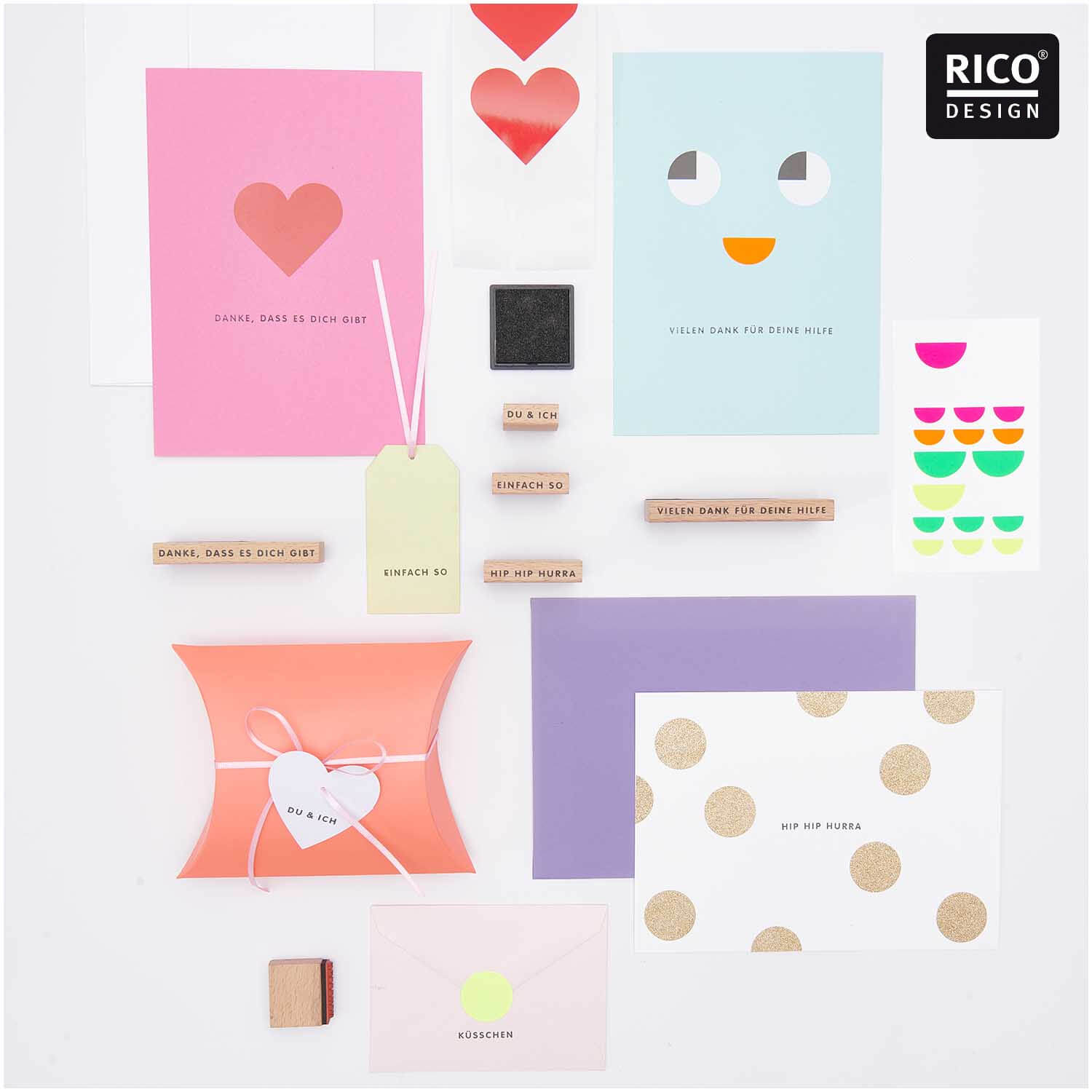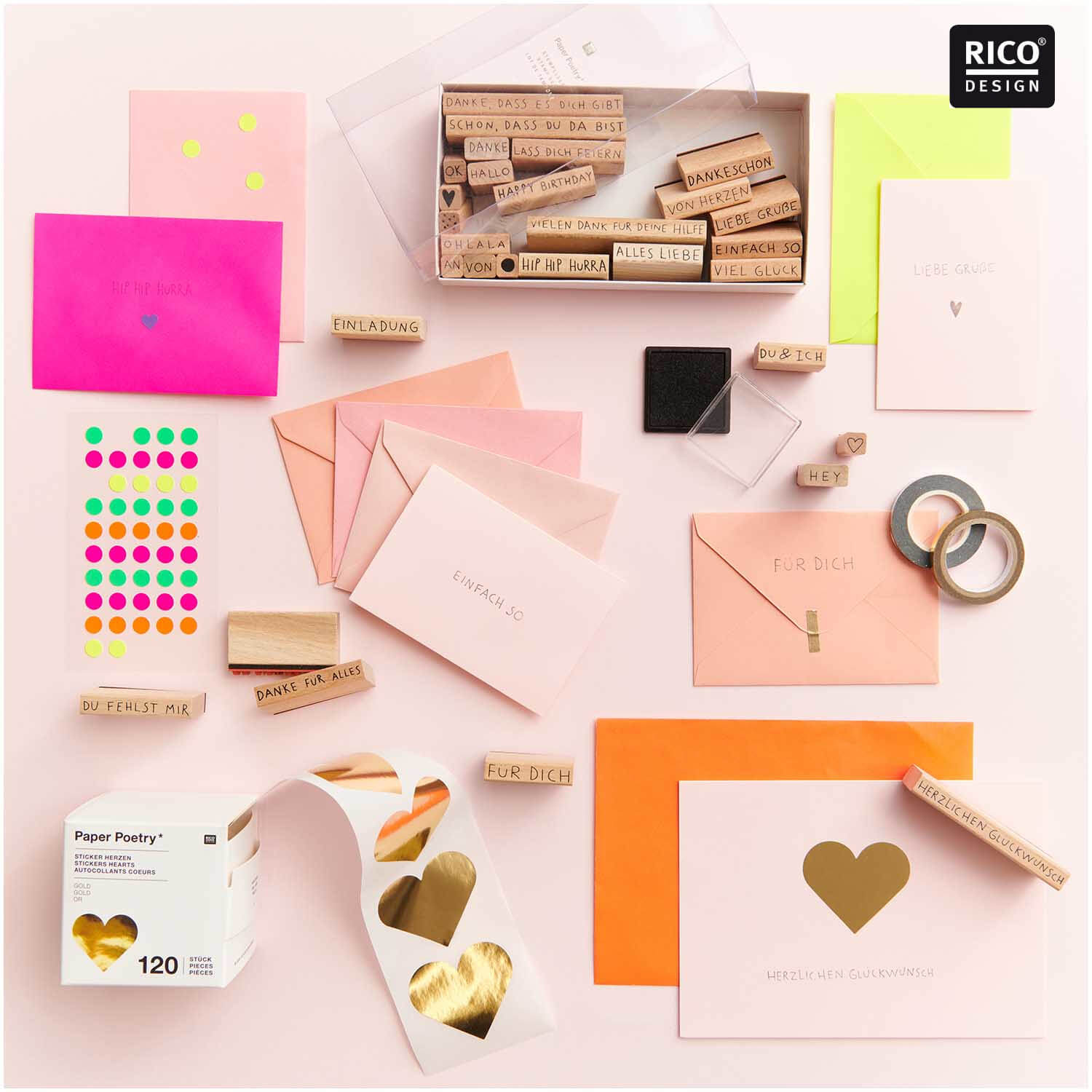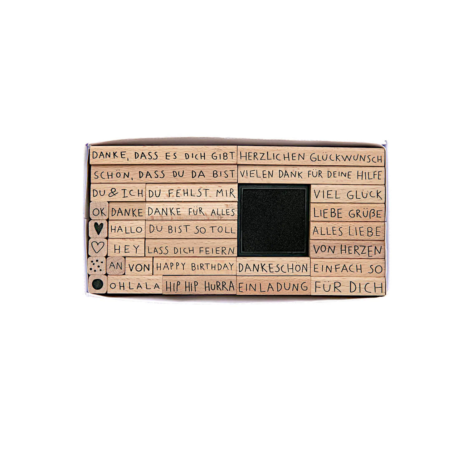 In dem Stempelset sind 30 Stempel und ein Stempelkissen in schwarz enthalten. Mit den Textstempeln lassen sich Glückwunschkarten, Dankeskärtchen, Briefe und viele andere Dinge auf Papier gestalten.