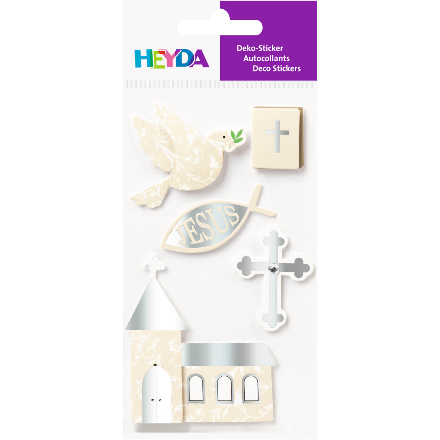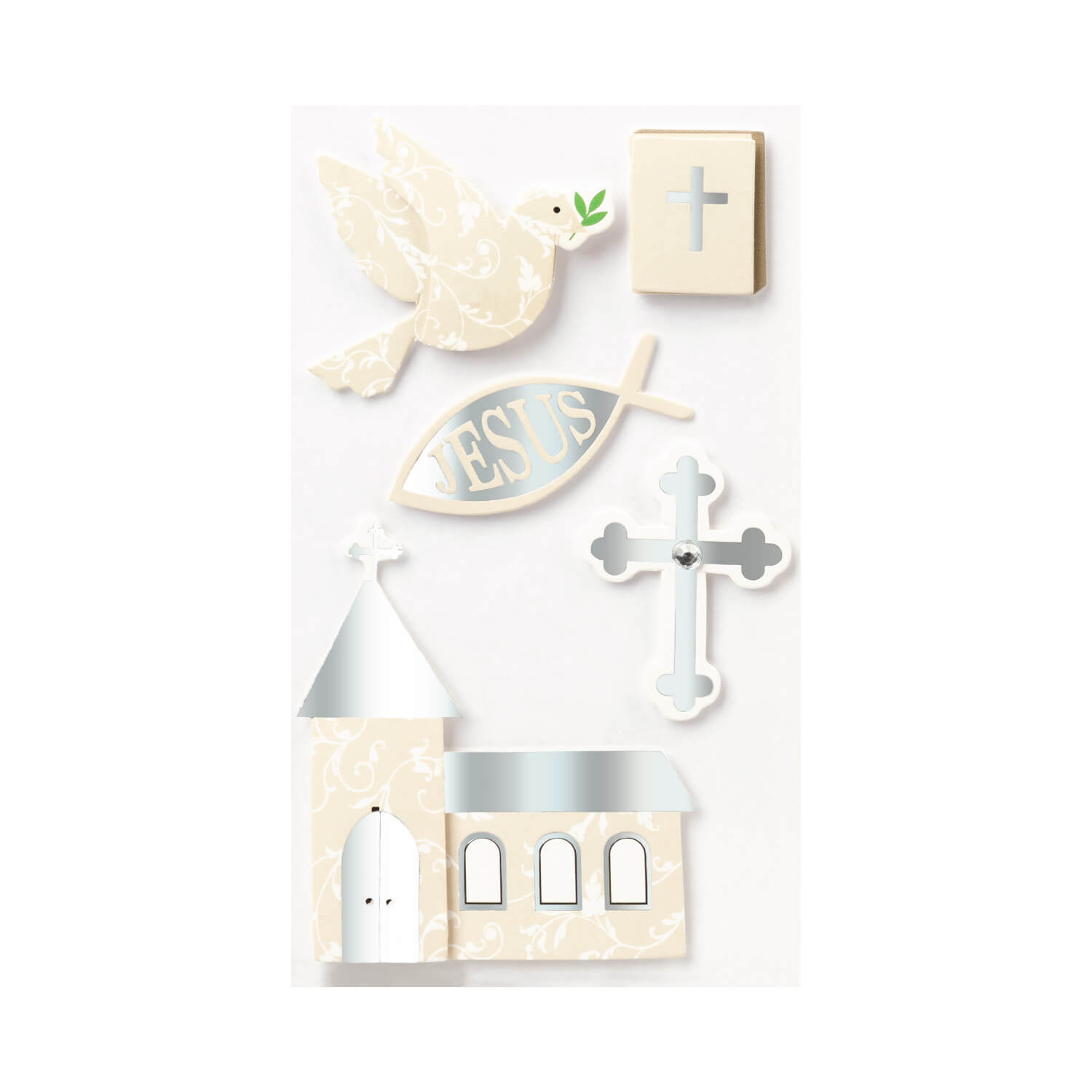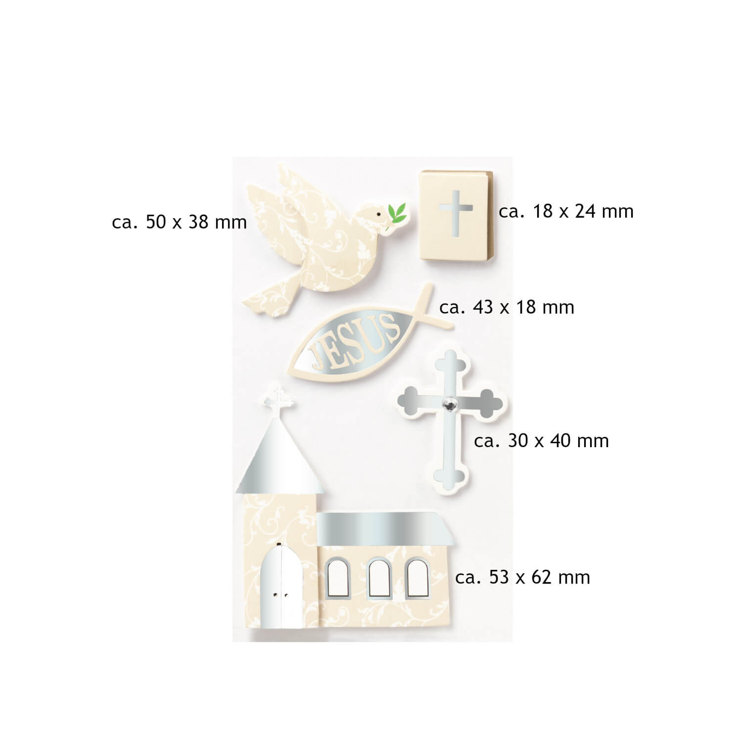 Diese Sticker sind speziell für die Gestaltung von Karten zu christlichen Anlässen konzipiert. Der Stickerbogen enthält eine Auswahl an 3-D-Stickern mit Symbolen von großer Bedeutung: die Taube als Zeichen des Heiligen Geistes, die Bibel als Quelle der Inspiration, der christliche Fisch als Symbol des Glaubens, das Kreuz als Zeichen der Erlösung und die Kirche als Ort der Gemeinschaft.
