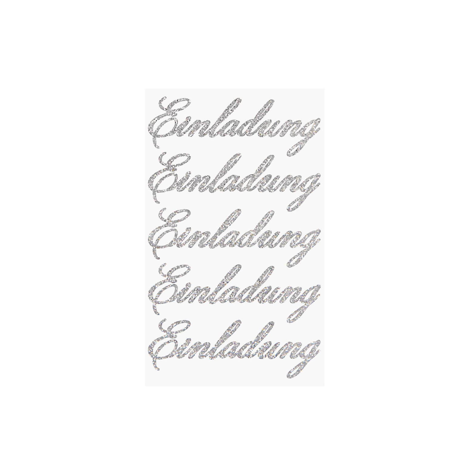 Die Schrift hat eine Größe von ca. 6 x 2 cm. Auf dem Bogen befinden sich 5 Sticker Einladung silberfarben.