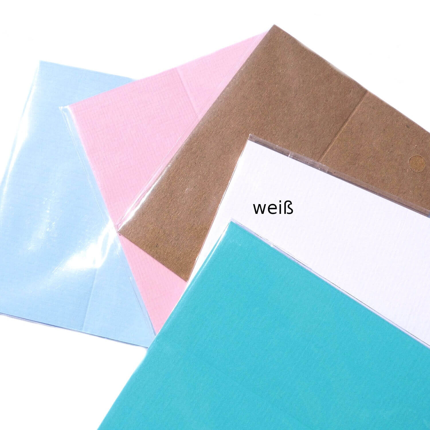 Zu einem Set gehören 5 weiße Tischkarten. Die Kärtchen werden flach geliefert. Die Faltkante ist bereits vorgefalzt. Die blanko Platzkarten können ganz nach eigenen Ideen gestaltet werden.