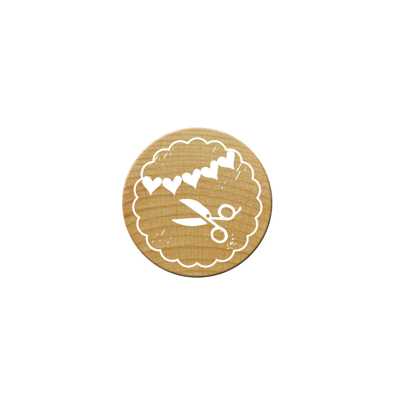 Runder Holzstempel von Woodies mit Schere und Girlande
